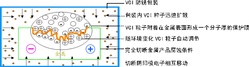 VCI是英文(Volatile Corrosion Inhibitor)的縮寫,它是一種具有揮發(fā)性的腐蝕抑制劑,簡稱為氣化性防銹產(chǎn)品。當用氣化性防銹產(chǎn)品包裝好被包裝物以后,防銹產(chǎn)品的防銹粒子氣化成氣體,吸附在金屬表面形成保護膜,切斷金屬離子與水、氧氣接觸的可能性,有效抑制了金屬腐蝕電化學反應的發(fā)生,從而達到防銹效果。包裝后內(nèi)部的防銹粒子的氣化擴散量自動調(diào)節(jié),當濕度或溫度增大時,防銹粒子的擴散量也會加大, 反之,防銹粒子的擴散量會減小,從而來自動調(diào)節(jié)包裝物內(nèi)部的氣體濃度,讓包裝物始終處于一種最穩(wěn)定的防銹狀態(tài)。